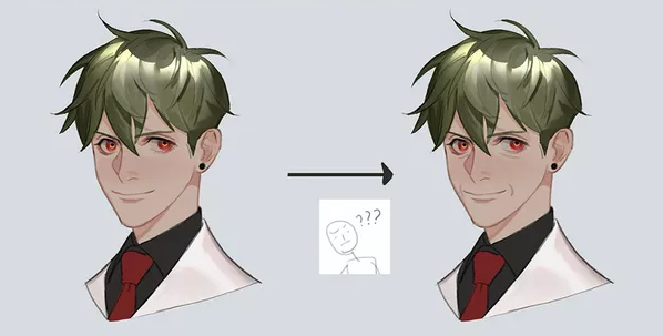 如果在画大叔的时候直接在画好的青年的脸上画法令纹,这样其实就像在美少女脸上加胡子一样奇怪。