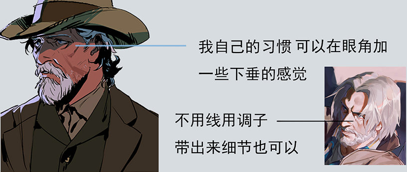 随着年龄增长人的皮肤会松弛下垂,对于我们非写实风格的图只需要强调一些能够突出年龄气质的细节就可以了。