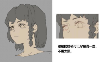 接下来我会填充一些固有色,如发色和肤色。像眼睛附近的线稿会用浅色重新描一下。