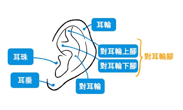 「耳轮」指的是耳朵的外缘。耳轮内侧有「对耳轮」,因为是和耳轮成对的部位所以叫做「对耳轮」,这样想会比较容易记忆。