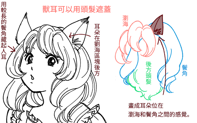 另外,绘製兽耳角色时该不该画上人类的耳朵也是个问题,这可以配合个人的设定去进行调整。一般来说,选择用头髮等盖住人耳的位置而不绘製的状况比较常见。