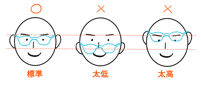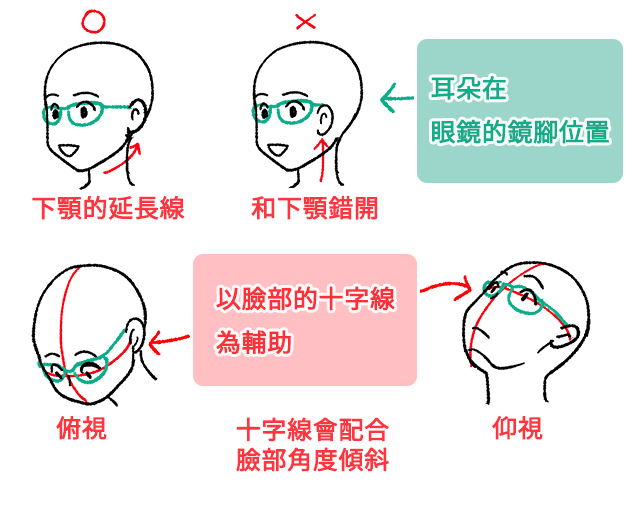 耳朵最上缘和和眉毛相近,最下方和鼻头相近,决定耳朵的上下位置时能以此为基准,留意支撑眼镜镜脚的位置。绘製少女漫画风的图时,很多人会把位置画得太低,这点请注意。