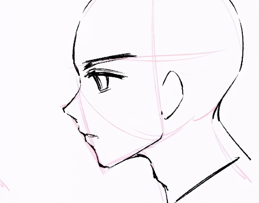 好,到这块下颌骨的部分的话,就是把这个地方稍微的画一下,这个地方其实是显示出男生骨骼它比较明显一些。然后m把脸型,然后把多画出来。男生眼睛这一块就没有女生稍微那么大,你如果是画萝莉的话也会你画萝莉对应的正太的话也会大一点。这种话稍微小一些。好。然后把眉毛画上,男生眉毛画整体,绘画的比女生要粗一些,然后把这双眼皮戴上,把整个头颅补一补。好在画的时候,男女生这里又有一个区别,就是脖子,我只画男生可以把这个喉结给画一下,然后整个男生的脖子会稍微粗一点宽一点。