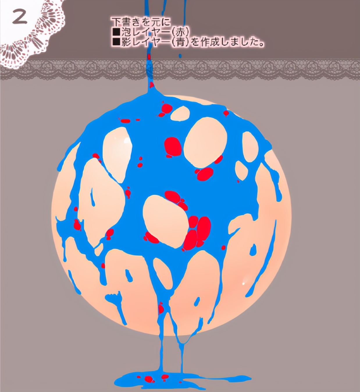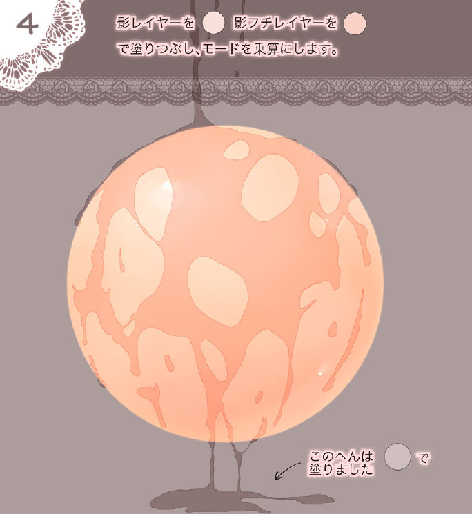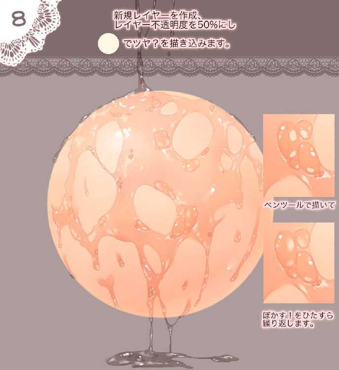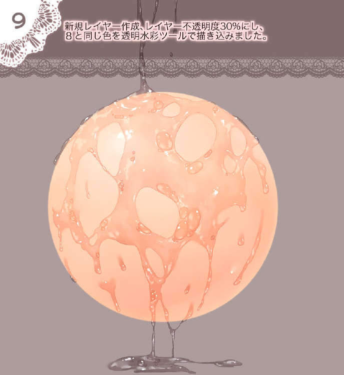在新图层中用水彩圈=圈,透明水彩工具等画出汁液的拉奇和ハド,最后调节图层的不透明度就完成了