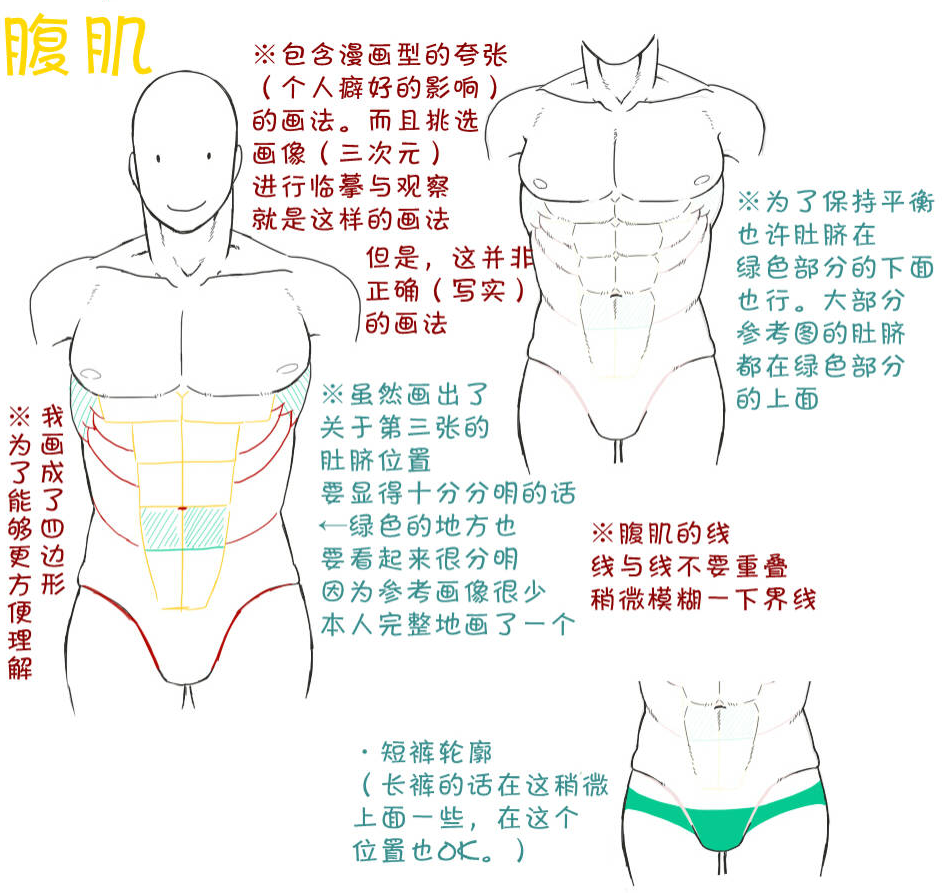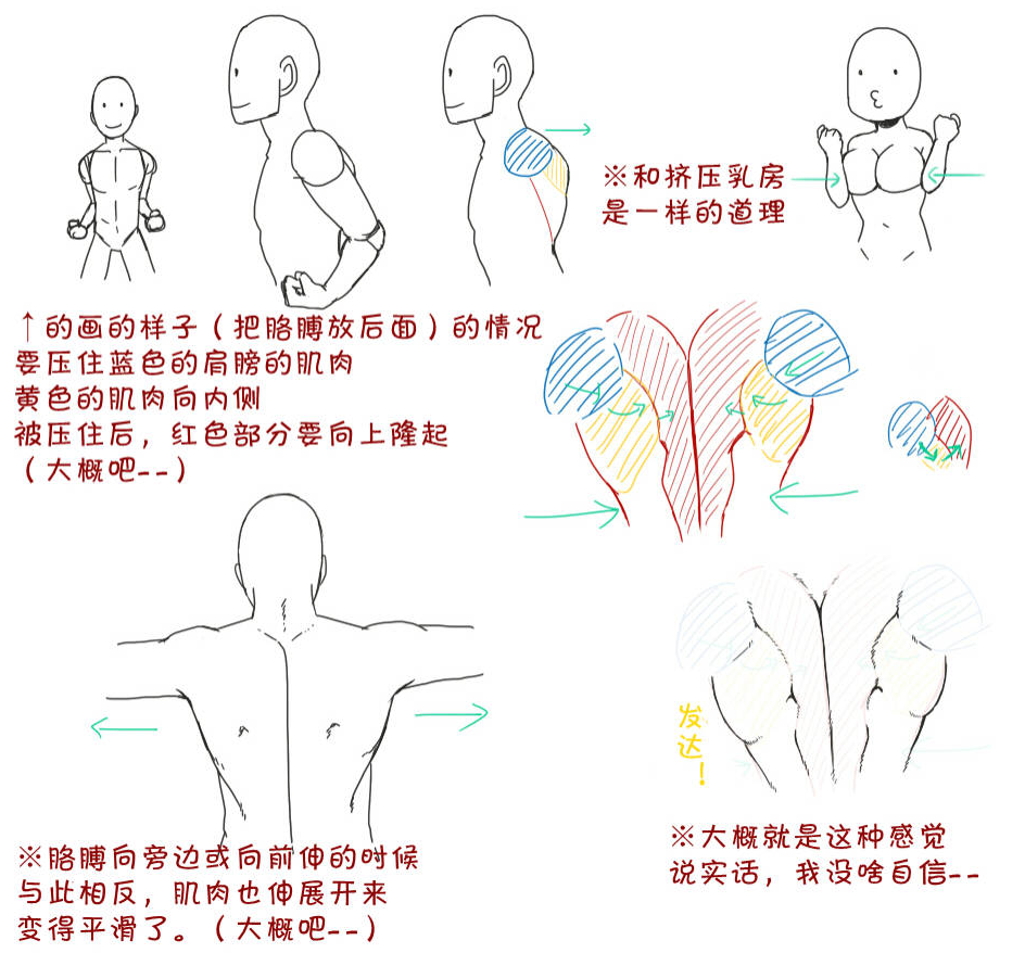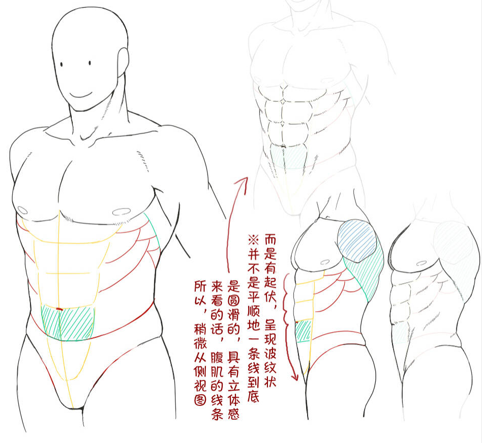 和脖子上的肌肉一样不要画太结实只是,中心线与从腋下到腰部的线要清晰