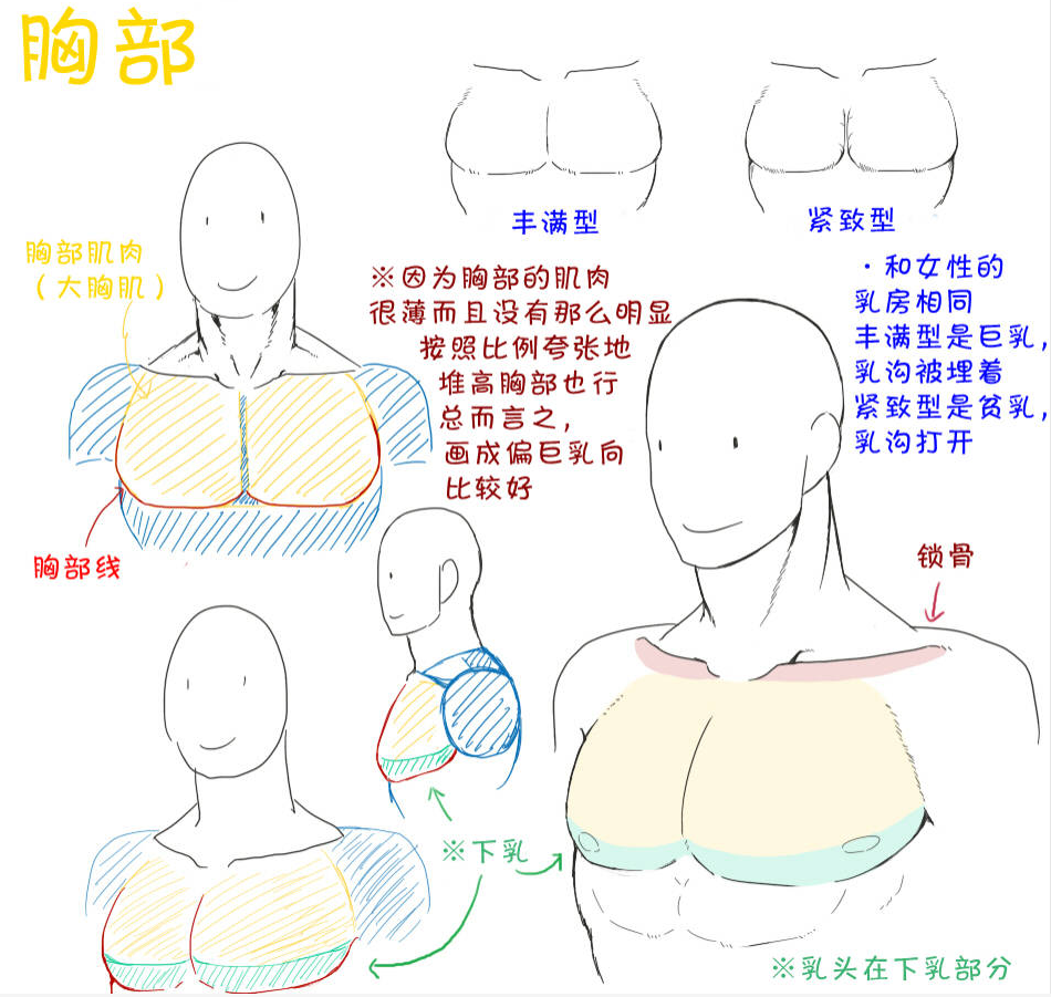 因为胸部的肌肉很薄而且没有那么明显按照比例夸张地堆高胸部也行总而言之,画成偏巨乳向比较好!