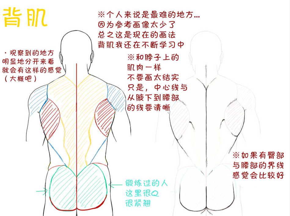 个人来说是最难的地方...因为参考画像太少了,总之这是现在的画法背肌我还在不断学习中