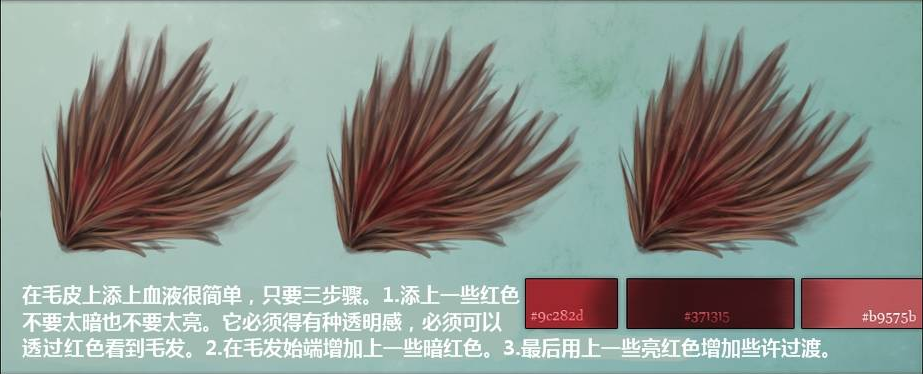 在毛皮上添上血液很简单,只要三步骤。1.添上一些红色不要太暗也不要太亮。它必须得有种透明感,必须可以透过红色看到毛发。2.在毛发始端增加上一些暗红色。3.最后用上一些亮红色增加些许过渡。