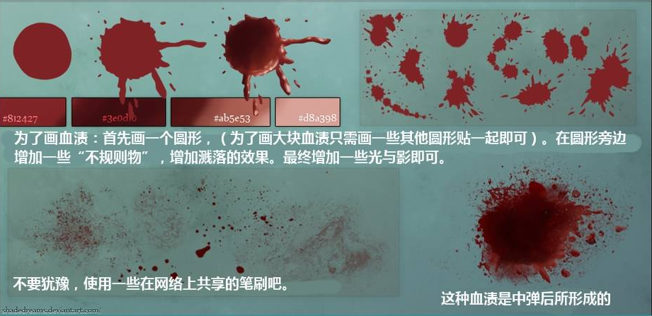 为了画血渍:首先画一个圆形,(为了画大块血渍只需画一些其他圆形贴一起即可)。在圆形旁边增加一些“不规则物”,增加溅落的效果。最终增加一些光与影即可。