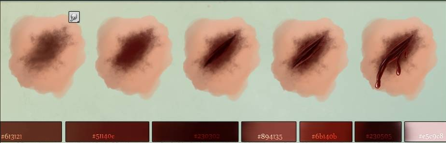 第一步,不要使用实心笔刷,而是在血块中心用手指涂抹亚具。在另外一块红色上面重复该步骤。现在你可以画割痕了(在这里是个大创伤)。画割痕你要使用暗红色并且不要画的太规则。这步之后。添加一些亮红色过渡割痕伤口。你最后可以添上鲜血,如果你需要参考物。可以运用水。以白色反光与阴影等细节来结尾。