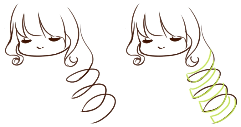 不同的技术可用于完美卷曲。首先画一个弹簧并勾勒出前部轮廓。然后复制该线条形状。