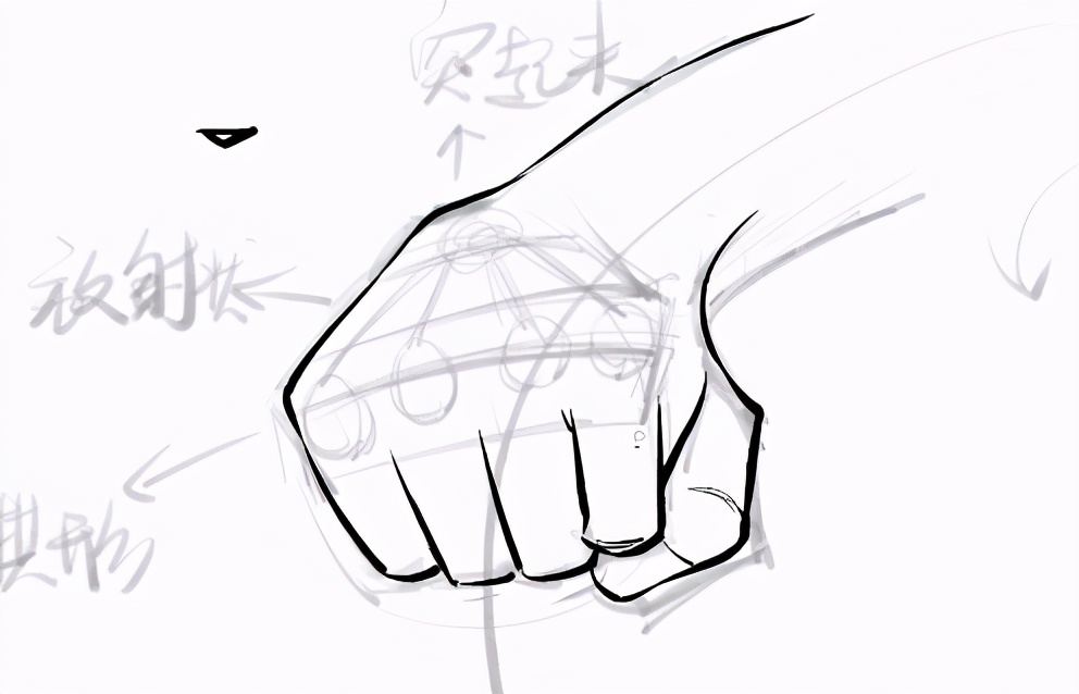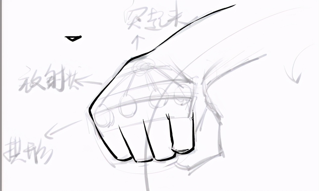 然后在上面这上面我们不能就让他这么简单,对吧?这上面我们可以给他拿一点点,像这样的一个线条,你的骨头这样子打人会比较疼,他会有一块凸出来的像菱形的一个形状,这样看起来我们画的就比较细致一点了,对吧?然后在金的一个方向,你看跟着我们放射状去走。没问题。然后这边是不是也是一样的?这里甚至你可以把它稍微画鼓起来,一点点都是没问题的,都是可以的。然后这边手手臂稍微让它粗一点点。