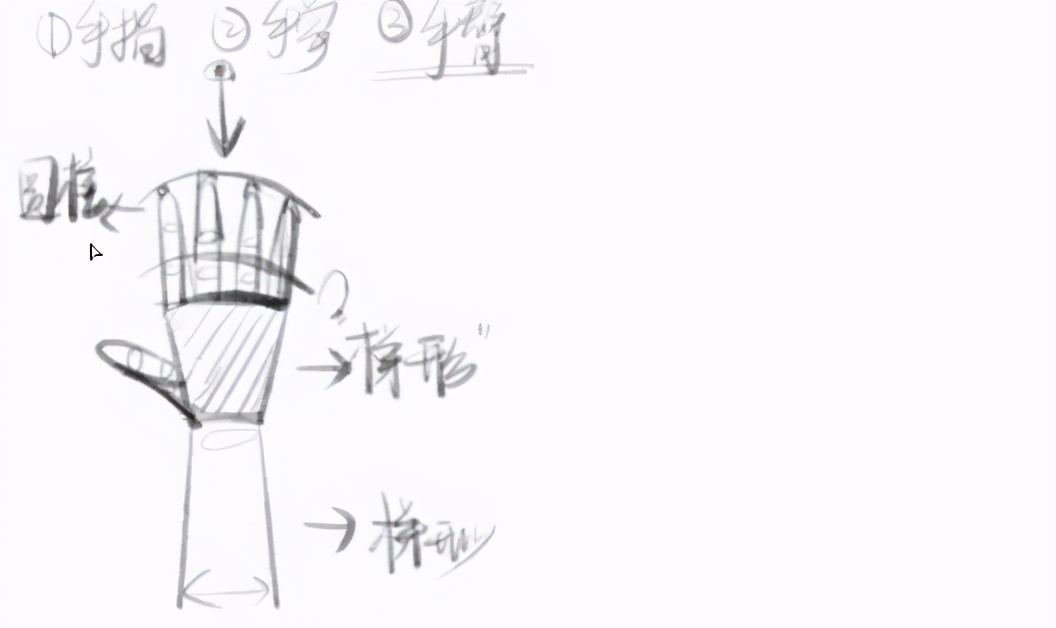 然后这地方也是鼓起来的,因为它是在手指跟手掌连接的地方,然后稍微把它画尖,画画硬一点点对吧?硬一点点。然后这里就可以有晚一点收进来。