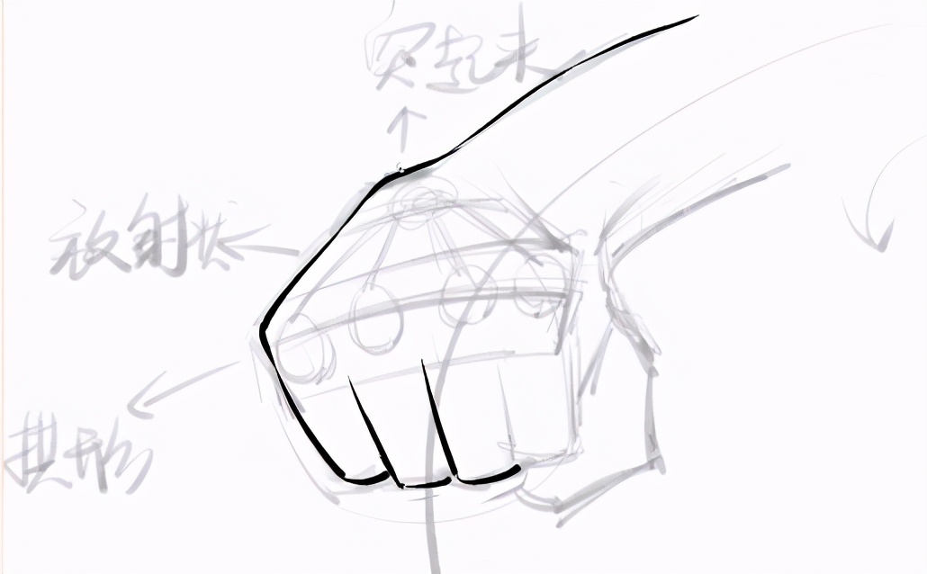 然后这里的一个长这里的一个关系让他在不要这么明显,这样是不是一个挥拳的感觉了?这种感觉其实就已经出来了。Ok然后这地方是连接是吗?连接这个手臂的。连接手臂的。所以这一块把这一块关节画出来顶出来,这里是一个手指的那条筋,这也是手指的那条筋。然后再到就大拇指它会有一条筋连接在你的手臂上,然后再把这个手臂画出来。这样的话这个手是不是就被我们带出来了,对吧?