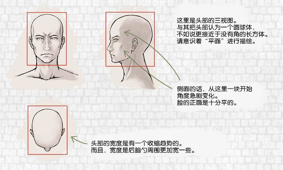 与其把头部认为一个圆球体,不如说更接近于没有角的长方体。请意识着“平面”进行描绘。