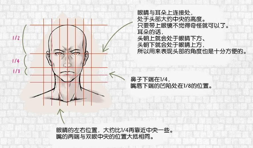 鼻子下端在1/4,嘴唇下端的凹陷处在1/8的位直。