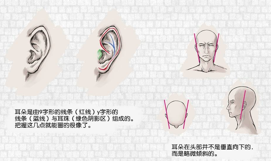 耳朵是由9字形的线条(红线)y字形的线条(蓝线)与耳珠(绿色阴影区)组成的。把握这几点就能画的很像了。