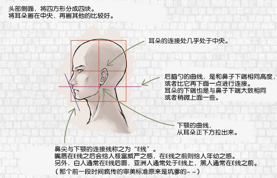 耳朵的连接处几乎丁十大。后脑勺的曲线,是和鼻子下端相同高度,或者比它再下面一点进行连接。耳朵的下端也是与鼻子下端大致相同或者稍微上面一些。