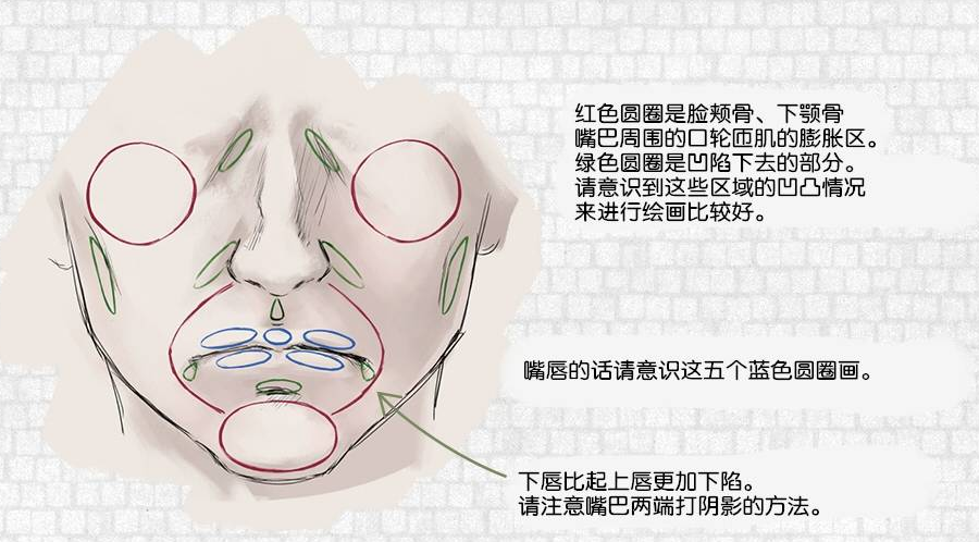 红色圆圈是脸颊骨、下颚骨嘴巴周围的口轮匝肌的膨胀区。绿色圆圈是凹陷下去的部分。请意识到这些区域的凹凸情况来进行绘画比较好。