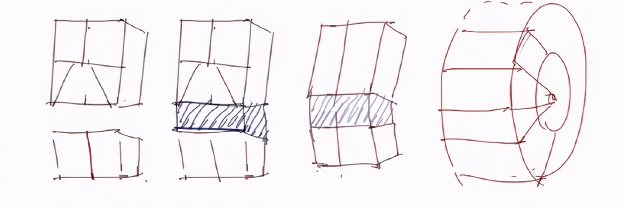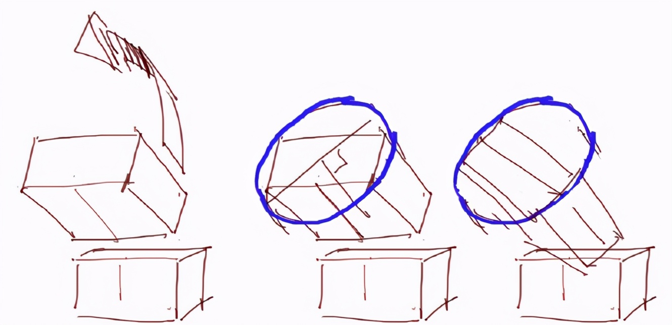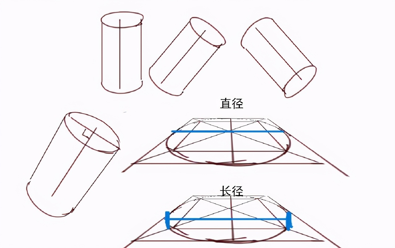 这样我们确定了圆柱方向的同时也确定了椭圆的方向,接下来只要根据柱形长短,判断透视,考虑椭圆的形状就行,这个稍微注意一下,很快就能熟练,有时候刻意画圆反而能强化体积。