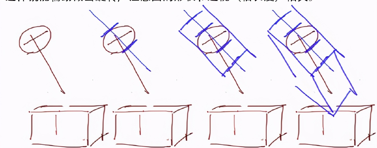 但是那么大个圆,我不可能每次都画,很累,所以我换个思路,画个小圆,这个小圆足够做辅助了,当你给定一个方向,与圆弧交点的切线方向就是垂直边的方向,你可以通过小圆辅助,在确定一个方向的同时,推理出另一组边的方向,快速画出一个面。同时,面的透视也要和椭圆透视结合。