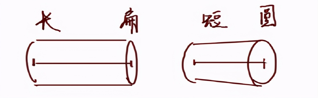 从下面三个圆柱体,我们可以发现,不论什么角度,轴和椭圆长径永远垂直,长径和直径不同,请注意区分,长径是指椭圆距离最远的两个点形成的长度。