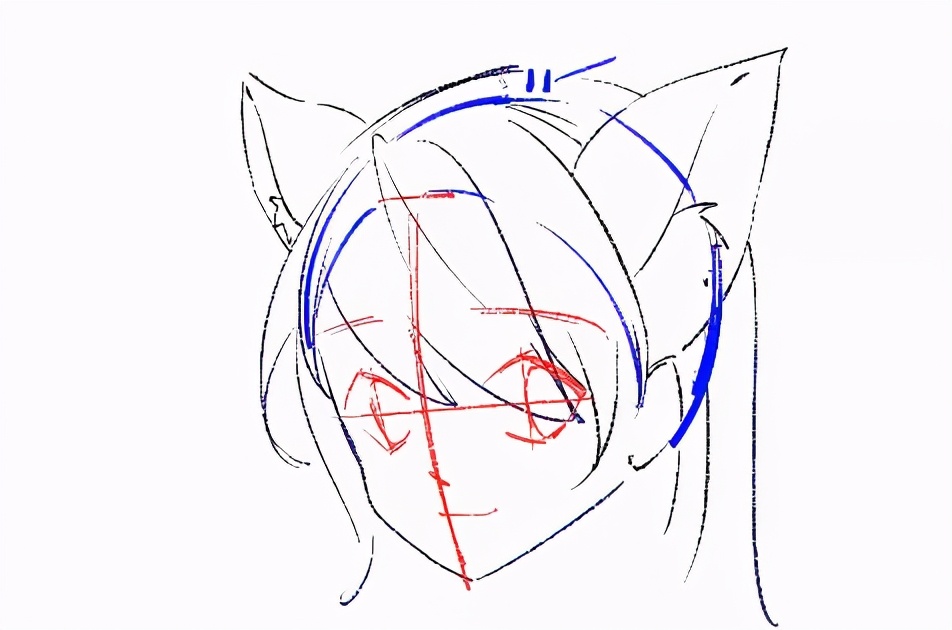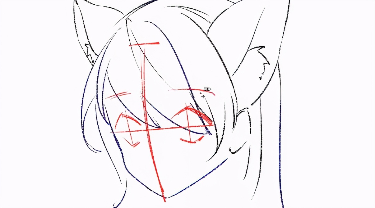 好,这个十字线的话一般二次元女孩子眼睛会比较大一些,所以你的位置可以稍微低一点,这里基本上是1:1的这样一个比例就可以了,接下来的话就定一下眼睛的形状的眼睛形状,你可以先去换两条竖线,大概的整个感觉先把握一下,然后再去画它的眼睛大小,很多同学在画脸部的时候很容易把脸画得很大,然后脑画得很小,这里的话还有一个很容易出错的地方,就是眼睛的话画太小,然后就会很奇怪,然后画太大的话,就整个脸部都就膨胀起来那种感觉。