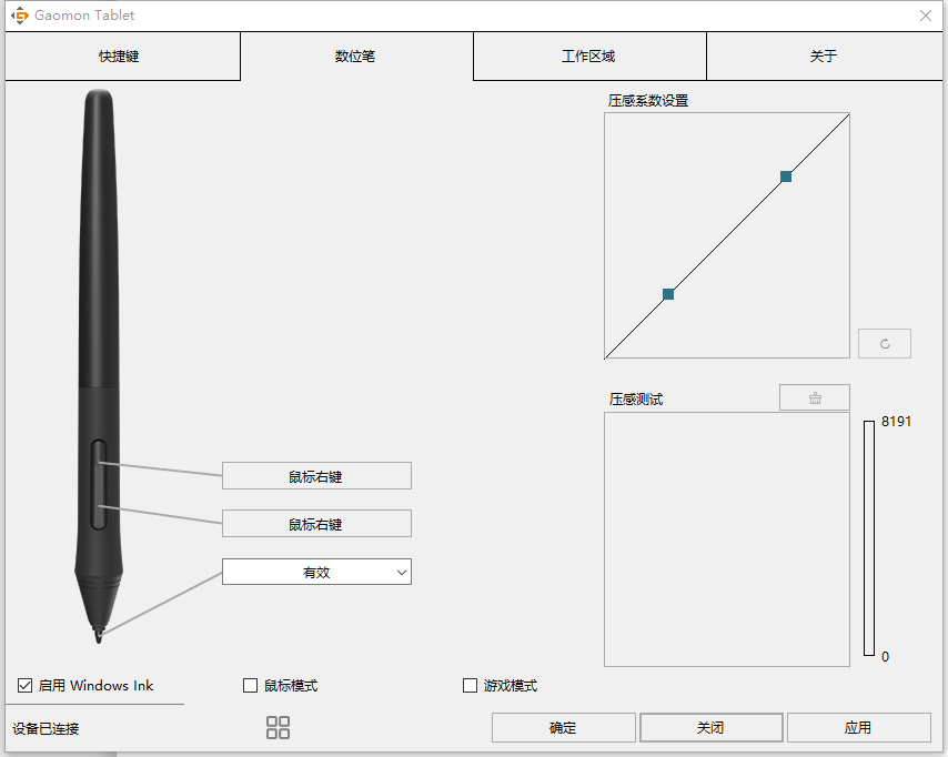 连接成功后,驱动-数位笔-压感系数设置,调节曲线来设置就好了~