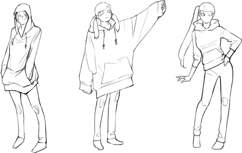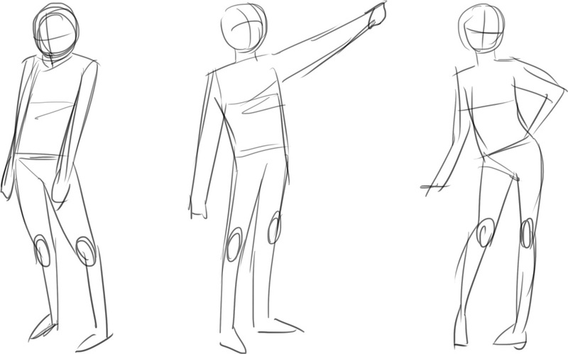 作为参考示例,请绘制三个具有相同身体形状的人,并注意四肢和头部的平衡。