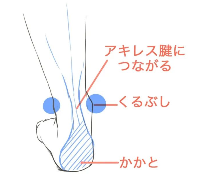 换个角度,从后面看脚,脚跟的形状向上延伸,连接到跟腱,且两侧有突出的脚踝。