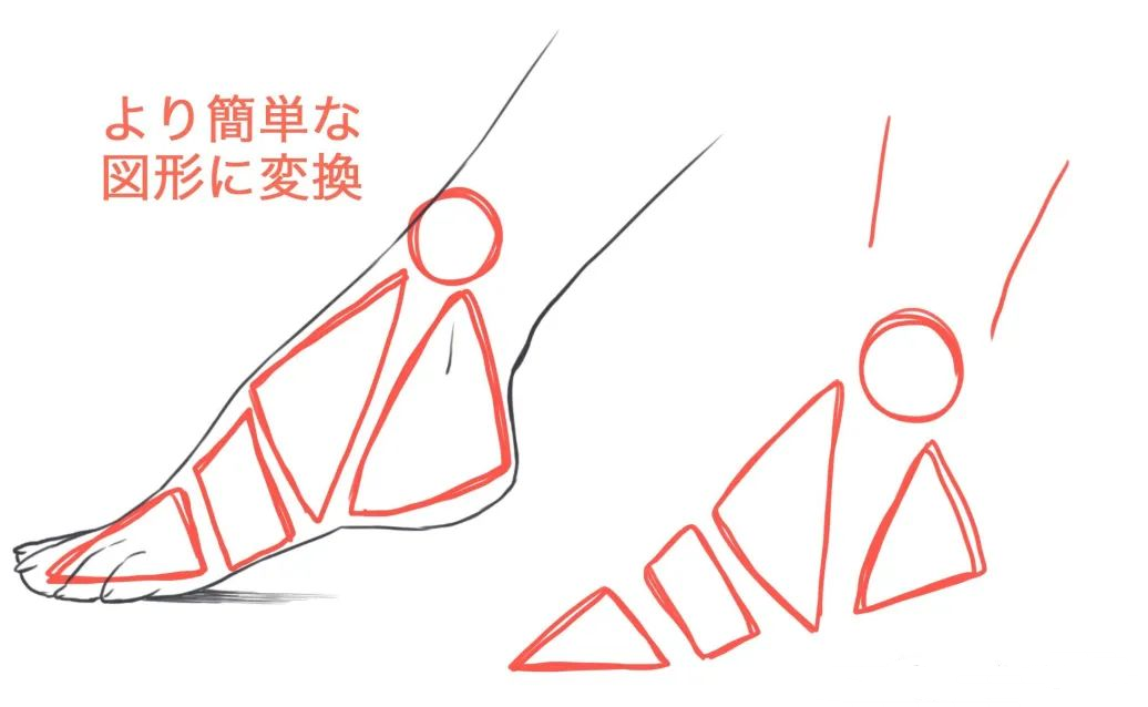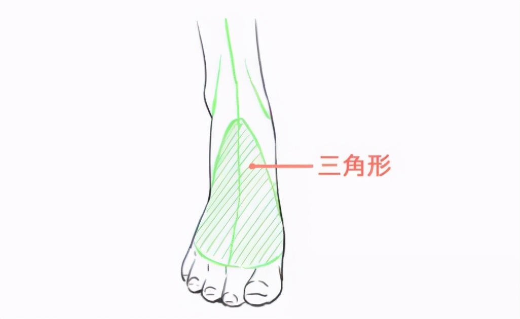 从前面看脚,你会发现这个形状有点复杂,貌似很难把握的样子。但只要借助辅助线和形状,你就能发现,原来脚从前面看主体是一个三角形。