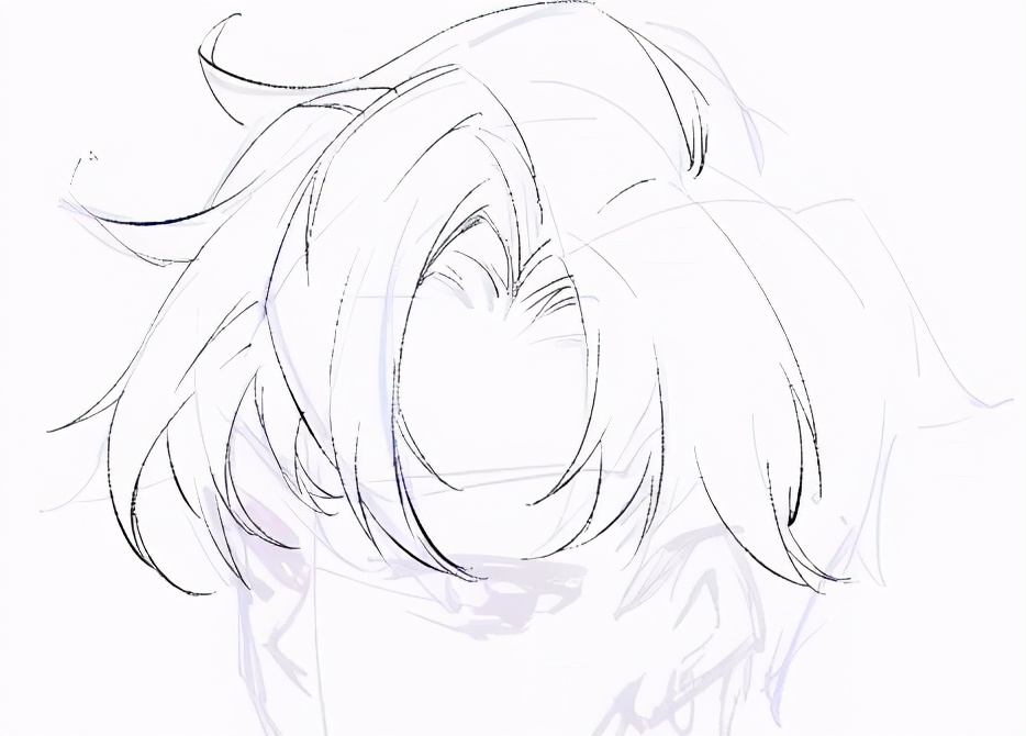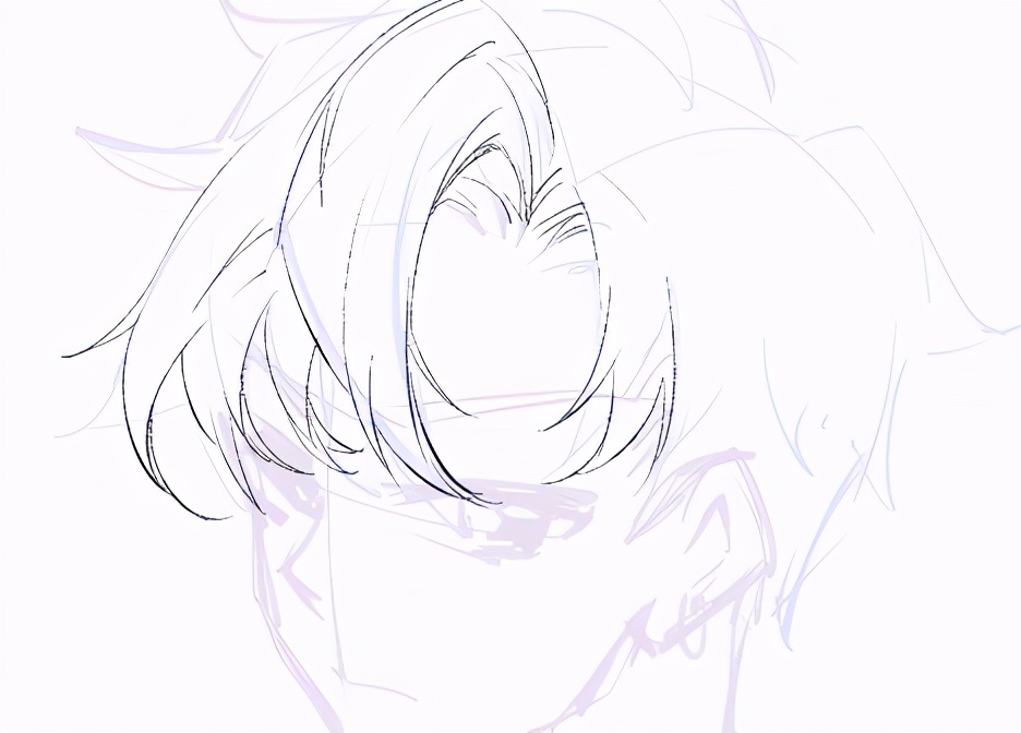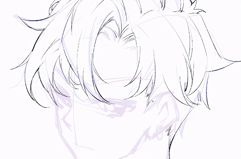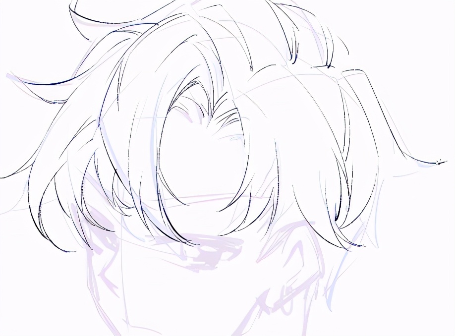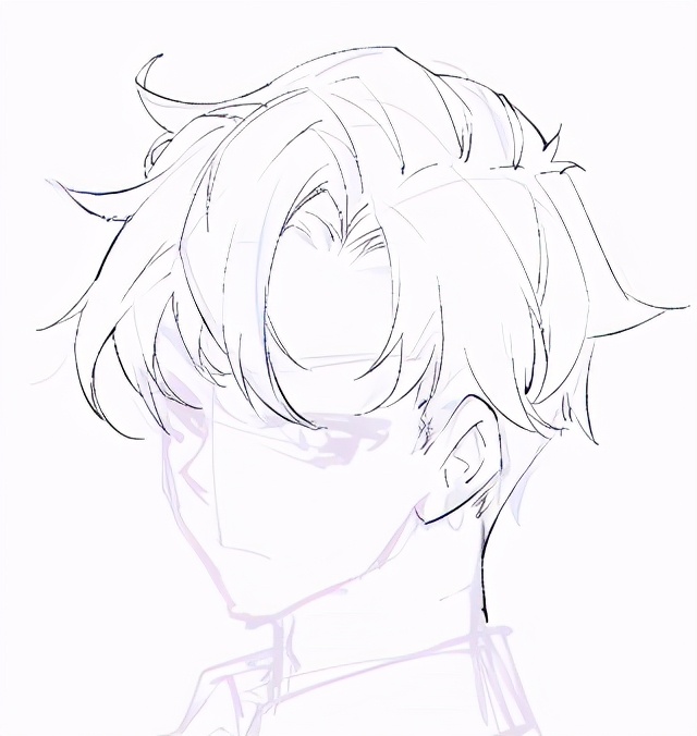画的时候男孩子的头发它会相对来说会比较蓬松,而且比较乱,但乱的意思就是说它方向会没有那么有规律性,换句话说可以稍微随意一点,但是你随意的时候要保持大中小,还有一些错漏遮挡的一些原则就可以了。