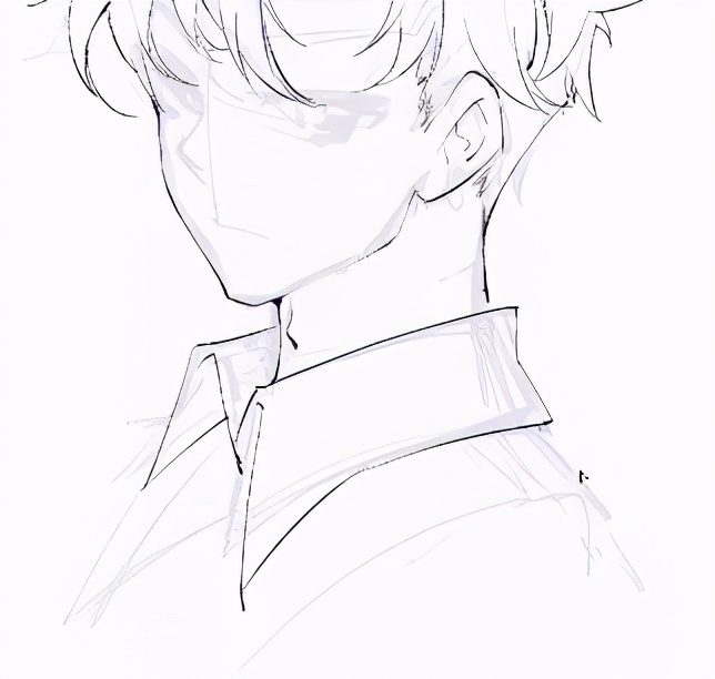 好,接下来的话就可能到了发尾这里,其实发尾这一块的话你不需要花的,但是同是一画就画完了,这些就不用画了。我就把脖子这一块加重一点。接下来这里有一个男生头发会有一些那时候叫鬓角一样的地方,也不用管它,直接带出耳朵就好了。里面的话里面这五官的用线可以轻松一些。
