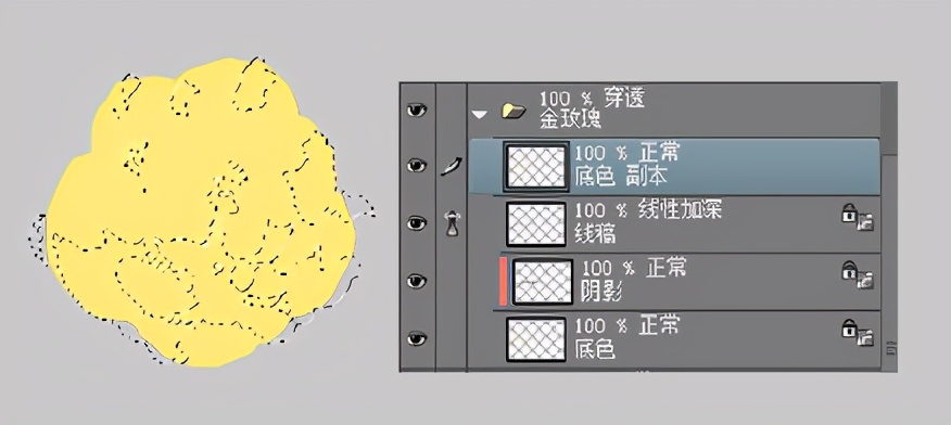 复制底色图层,放在最上,按住ctrl键单击阴影图层,即选中了阴影图层的不透明区域。