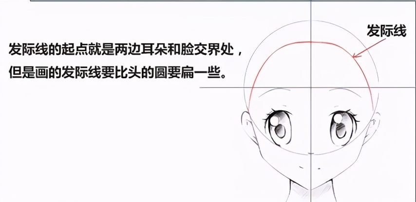 发际线的起点就是两边耳朵和脸交界处,但是画的发际线要比头的圆要扁一些。