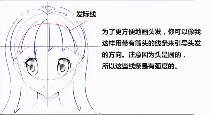 为了更方便地画头发,你可以像我这样用带有箭头的线条来引导头发的方向。注意因为头是圆的,所以这些线条是有弧度的。