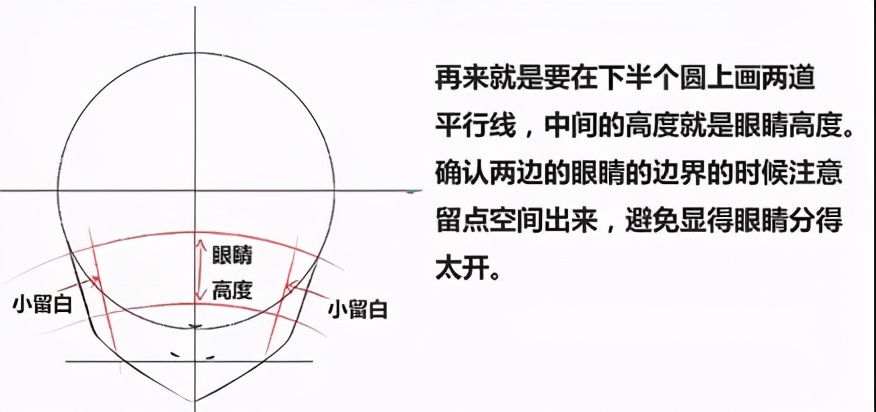 再来就是要在下半个圆.上画两道平行线,中间的高度就是眼睛高度。确认两边的眼睛的边界的时候注意留点空间出来,避免显得眼睛分得太开。