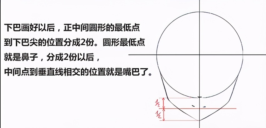 下巴画好以后,正中间圆形的最低点到下巴尖的位置分成2份。圆形最低点就是鼻子,分成2份以后,中间点到垂直线相交的位置就是嘴巴了。