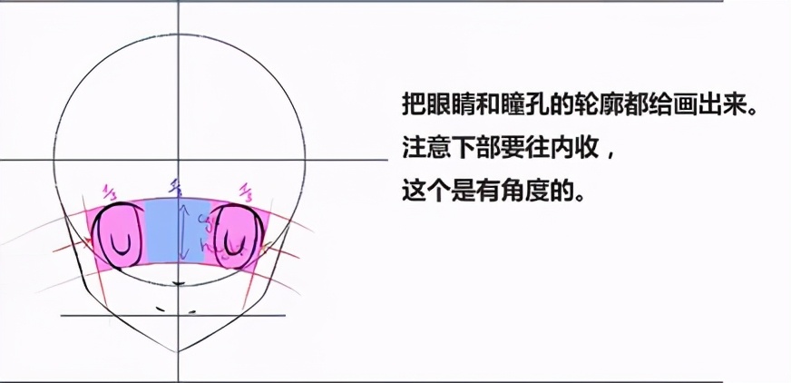 把眼睛和瞳孔的轮廓都给画出来。注意下部要往内收,这个是有角度的。