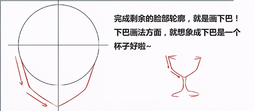完成剩余的脸部轮廓,就是画下巴!下巴画法方面,就想象成下巴是一个杯子好啦~