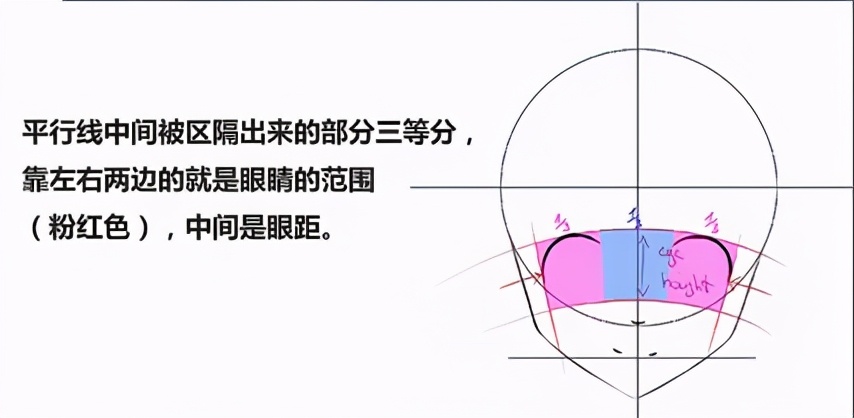 平行线中间被区隔出来的部分三等分,靠左右两边的就是眼睛的范围(粉红色) , 中间是眼距。