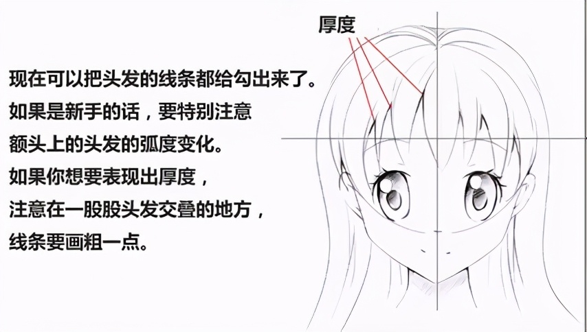 现在可以把头发的线条都给勾出来了。如果是新手的话,要特别注意额头.上的头发的弧度变化。如果你想要表现出厚度,注意在- -股股头发交叠的地方,线条要画粗一点。