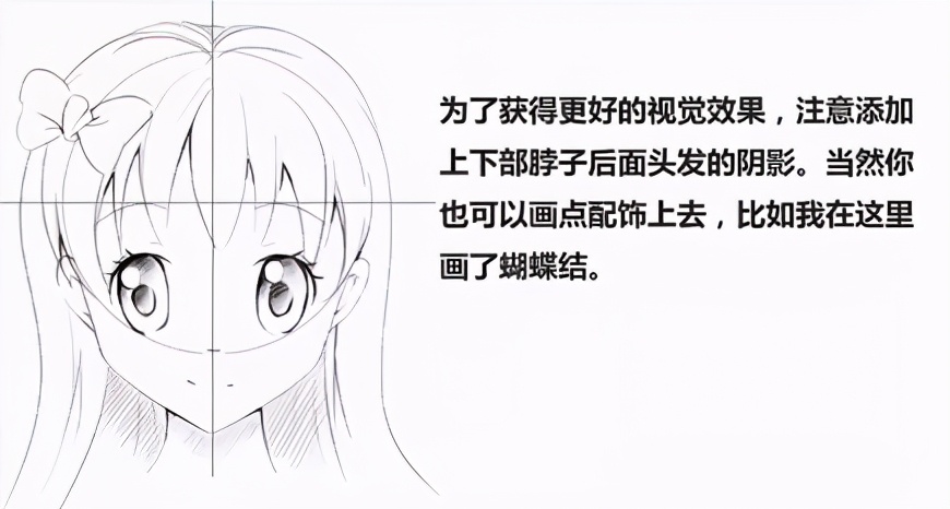 为了获得更好的视觉效果,注意添加上下部脖子后面头发的阴影。当然你也可以画点配饰上去,比如我在这里画了蝴蝶结。
