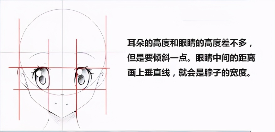 耳朵的高度和眼睛的高度差不多,但是要倾斜-点。 眼睛中间的距离画上垂直线,就会是脖子的宽度。