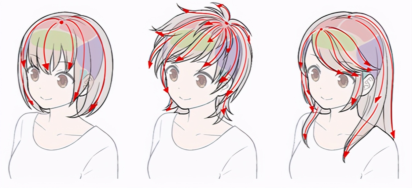 在这些色块的基础上,用箭头来大体把头发生长的方向确定一下。
