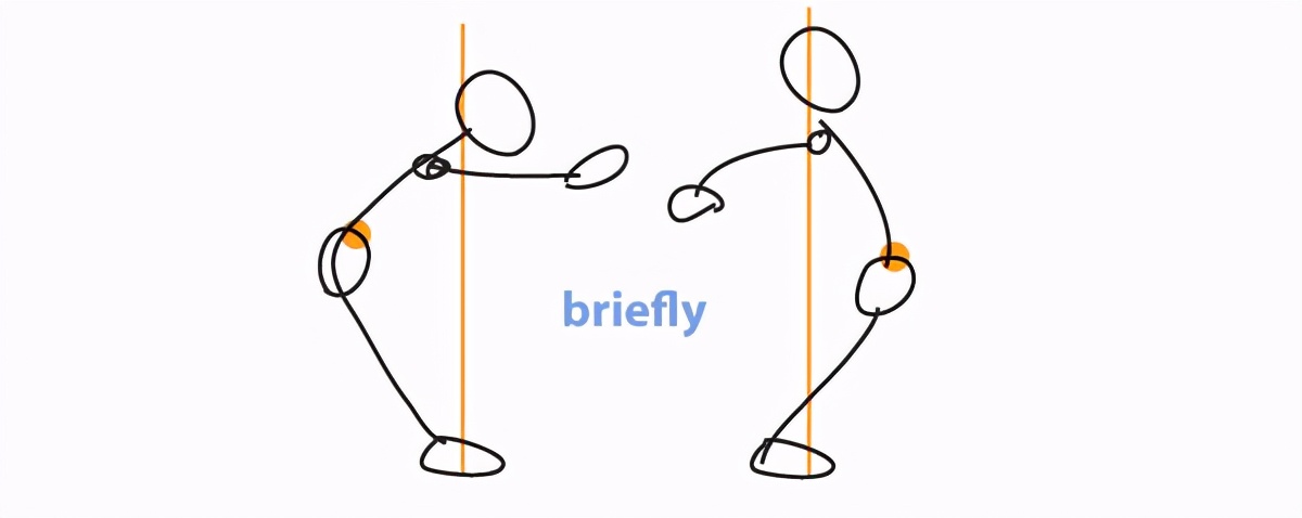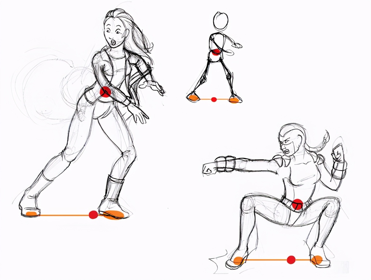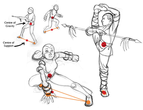 下面是这一动态的例证:当左边的角色转移她的重量到她的前脚并且后脚即将抬起时,后脚承担了很少的重量,即使脚还接触着地面。她的支撑中心因此接近她的前脚。这是因为她的体重很明显地在她的前腿,我们可以表达出她已经停止了运动,而不是在旁白中说明。右边的图显示重心仅稍微偏离中心但正是这个微小的视觉线索告诉我们重量正轻微地转移到左腿,使这个姿势免于看起来像武术课本中的图例一样无聊。