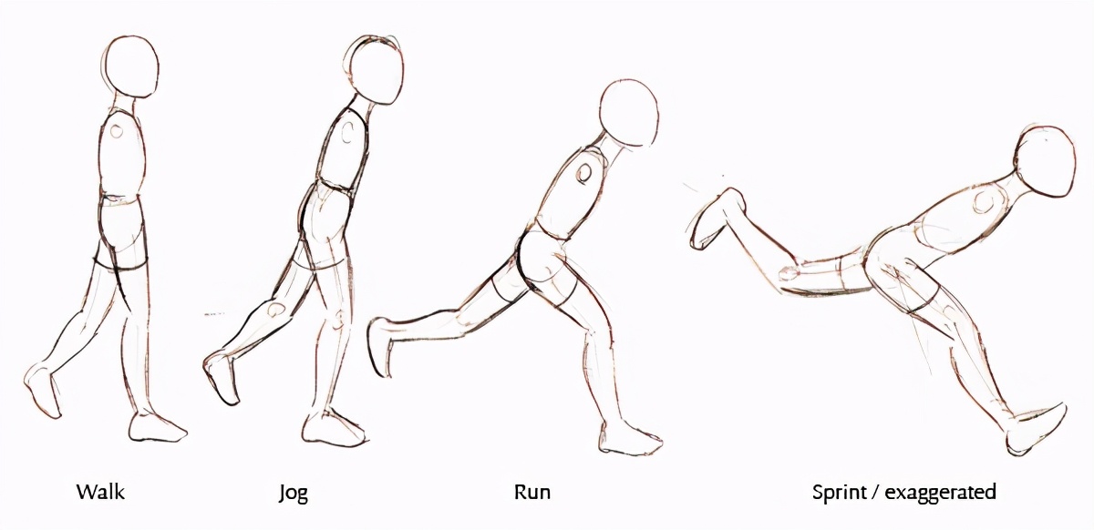 对于运动中的身体,我们换了一种角度来看待。失衡是任何运动的发动机,实际上你可以说运动是一种有控制的失去平衡。因此,我们将把这两个中心放在一边不去考虑,只考虑我们上面提到的概念:一个姿态的重心越是偏离,它表现出的运动越快,越充满活力和戏剧性。下面是一些在插图中经常用到的各种运动的指南。
