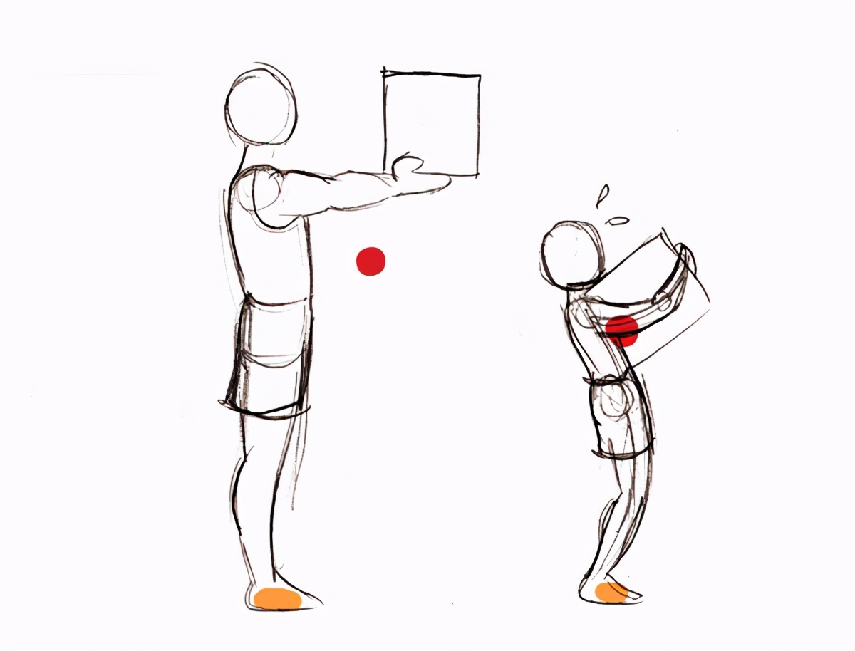 那就是说,肌肉因素一直在以不那么极端的方式发挥作用。例如,下面的角色提起的东西具有相同的重量。高个子有足够的肌肉力量,可以挺直手臂举着它,即使这改变了身体的重心。他有足够的肌肉力量去对抗这种影响。小个子力量小,所以他必须把铁块靠近身体,同时身体向后倾斜,以尽可能保持身体重心在原来的位置。