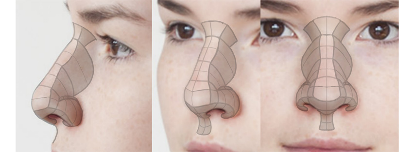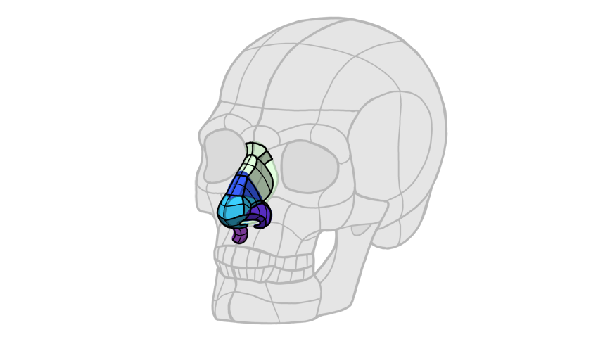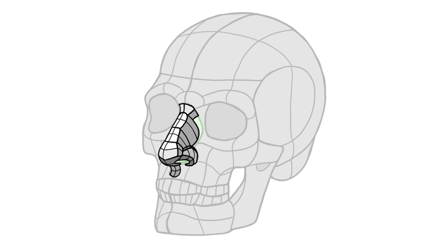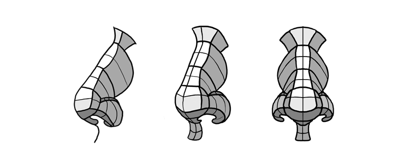 画出鼻子的一般形状。根据旋转角度,它应该是侧面和正面之间的中间形状。