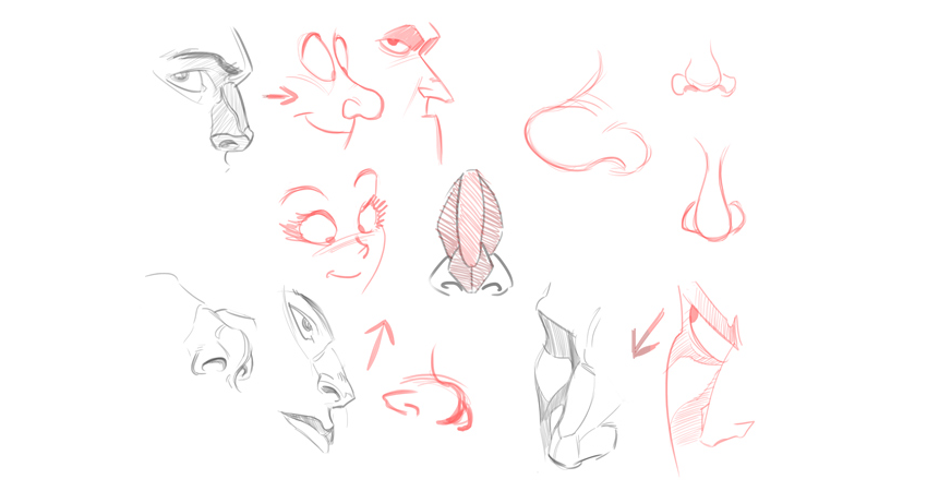 在卡通风格中,您可以夸大鼻子的可见元素。如果鼻子是尖的,则可以使它几乎变得锋利,如果鼻子很小,则可以使其变得很小,依此类推。这将使您突出显示字符之间的差异,并使绘制它们更容易。